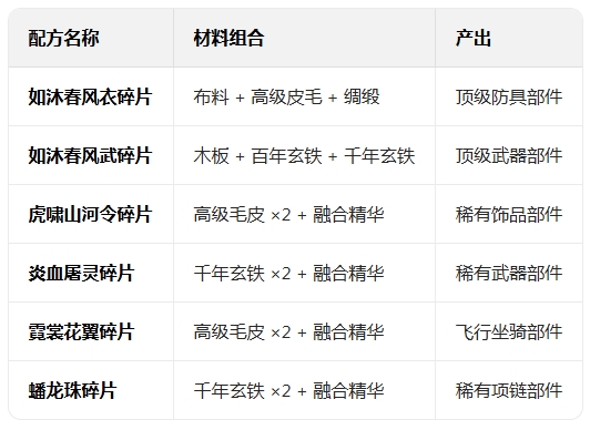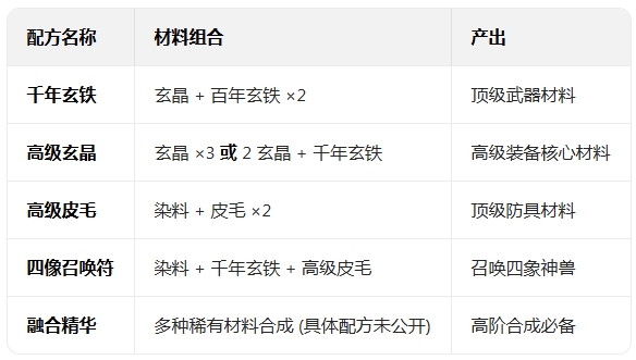 优先合成材料类配方:高级玄晶、千年玄铁、高级皮毛是制作顶级装备的基础