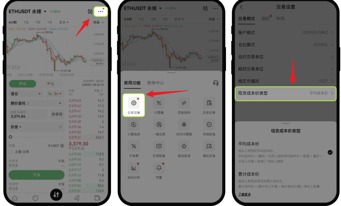 累计成本价对应收益会包括未实现收益和已实现收益,如果您想看近期现货交易买入的均价,可以切换为平均成本价查看。设置路径:交易页右上角3个点-交易设置-成本价基准-切换平均成本价或累计成本价。