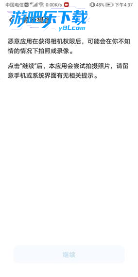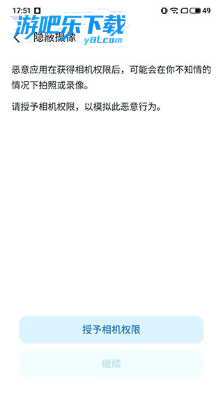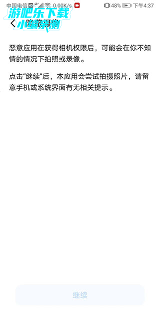 2、以隐蔽摄像为例,点开后并点击继续,虽然没有出现相机的界面,但状态栏有个红色的摄像图标;