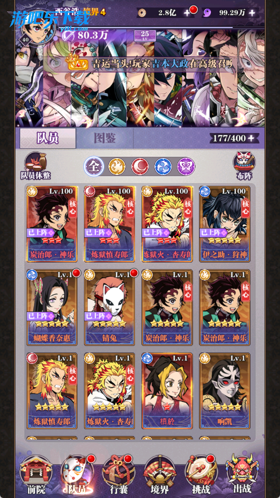 当然如果第一天送的高级召唤券中,抽取比较合适的输出和控制,也可以选择辅助或肉盾,推荐光富冈义勇、