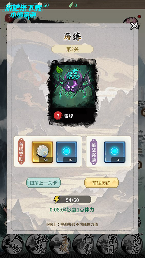 1、进入游戏后,玩家可以直接开始历练闯关,完成关卡,获取资源奖励,提升战力。