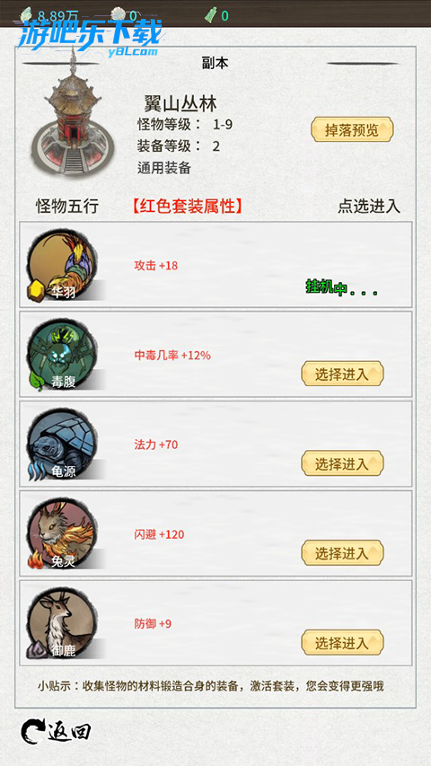 2、游戏内也有丰富的挂机副本可以选择,每种副本都有额外属性加成,玩家点击即可进入。