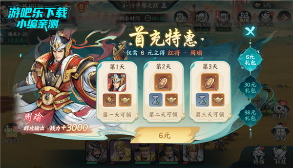阵容:周瑜(中排点火)+ 陆逊(中排引爆)+ 程普(前排承伤)+ 孙策(前排输出)+ 太史慈(后排点杀)