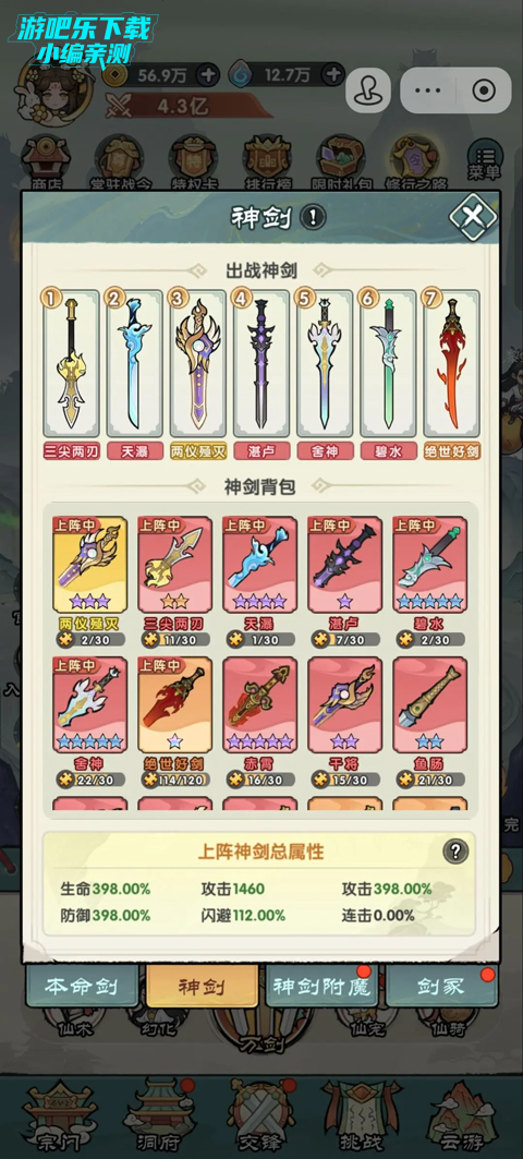神剑:一共可以上7把,靠剑冢消耗剑符抽取并升星。前期上5橙1红1黄,一个月后,红剑升得差不多就可以换上去使用,1黄6红。