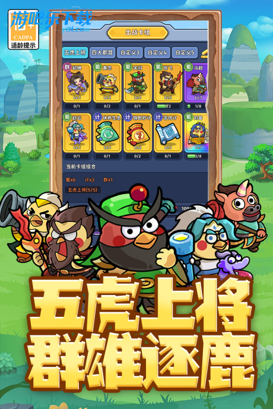 核心逻辑:五虎羁绊大幅提升攻击与暴击,张飞主 C 打爆发,关羽控场,赵云、马超突进,黄忠远程补伤,推图效率高,武将获取难度低。
