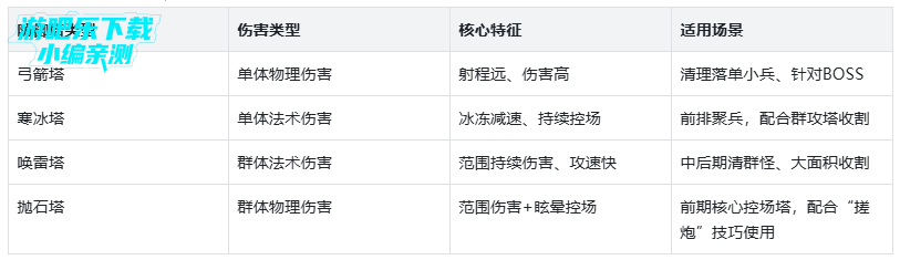 游戏内共4种防御塔,需根据战局搭配使用,核心作用如下:
