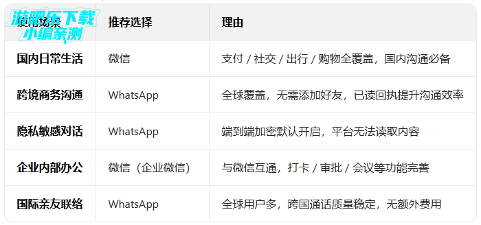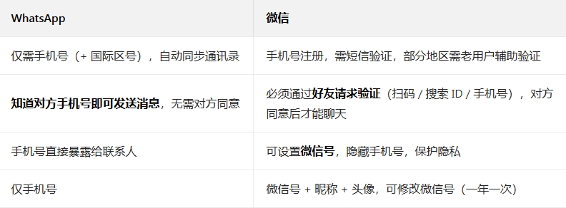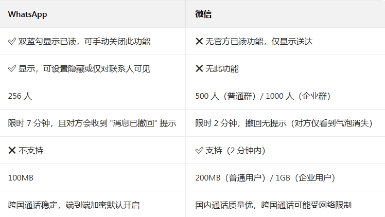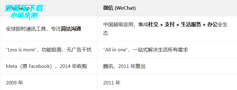 WhatsApp 是全球极简通讯工具(端到端加密 + 无广告),微信是中国超级生态平台(社交 + 支付 + 生活服务 + 小程序)。两者在定位、功能、隐私、用户分布上差异显著,选择取决于使用场景(国内生活 / 跨境沟通)与隐私需求。