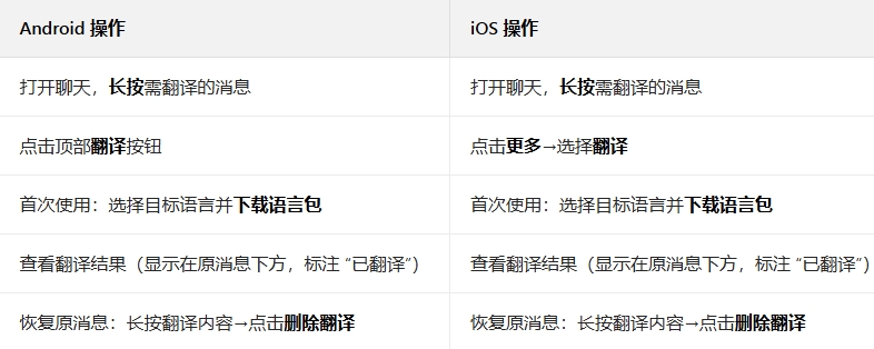 WhatsApp 内置翻译支持19 种语言,Android 可开启聊天自动翻译(iOS 暂不支持),所有消息可长按翻译,支持离线翻译(需下载语言包),外贸 / 跨境沟通必备功能。