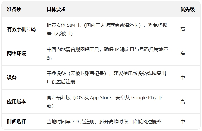 重要提醒:虚拟号码(如 Google Voice、TextNow)注册成功率极低,80% 以上会在 7 天内被封禁,强烈不推荐