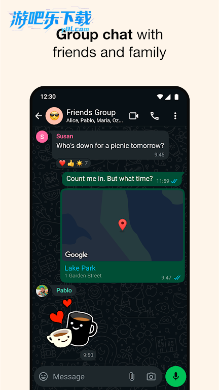 一对一 / 群组通话(最多 8 人),自适应网络优化通话质量,支持语音通话、高清视频通话,跨国沟通零成本,照片、视频、音频、文档(PDF/Word 等,最大2GB),联系人、语音备忘录、投票、状态(24 小时自动消失)。