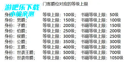 ②各个身份爵位的等级上限和书籍等级上限详细说明如下: