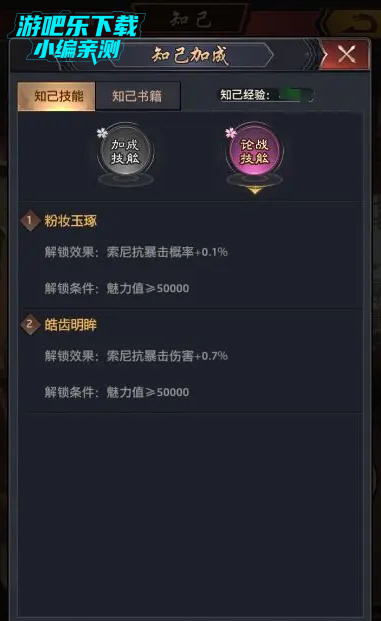另一类是知己加成,这类加成只有拥有知己加成的门客可以获得,该技能可以提高门客在衙门中的抗暴击几率和抗暴击伤害,减少衙门战斗中对方的暴击几率和暴击伤害,可以在知己界面的知己加成中学习论战技能。