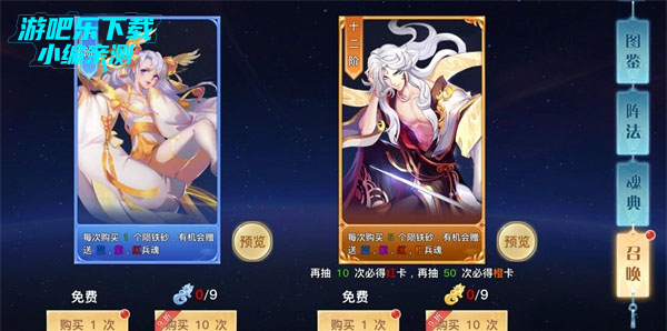 最后一个召唤界面就是获得兵魂伙伴的途径,分为每次购买1个陨铁砂(蓝、紫、红)和购买5个陨铁砂(蓝、紫、红、橙),十连抽会保底出红卡。阶级和品级越高的伙伴属性越好,能够转化给玩家的属性也越好哦。