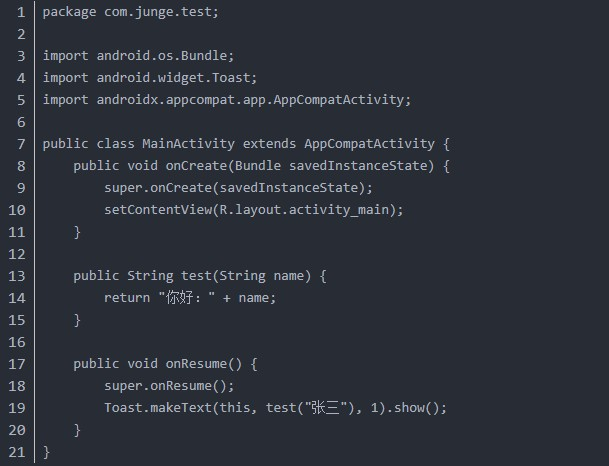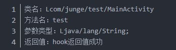 3、还是以这个代码为例子,进入该Activity后,会调用test函数,并传入"张三",并弹出提示,而test函数,返回的是"你好+姓名",我想通过hook,去修改它的返回值,改为"hook返回值成功",怎么做?
