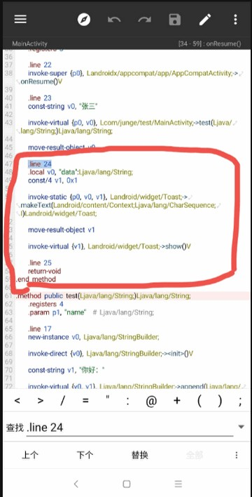4、接下来我们反编译app,验证一下,我们在smali代码中找到MainActivity类搜索.line 24使用Jadx查看java代码,也可以看到24行调用了makeText