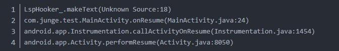 3、从前2行看,我们可以看到,在MainActivity的onResume方法里调用了makeText,通过(MainActivityjava:24),可以看出MainActivity类的24行中调用了make Text。