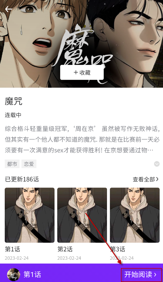 3、选择一本感兴趣的漫画,进入详情页后点击下方的“开始阅读”选项。