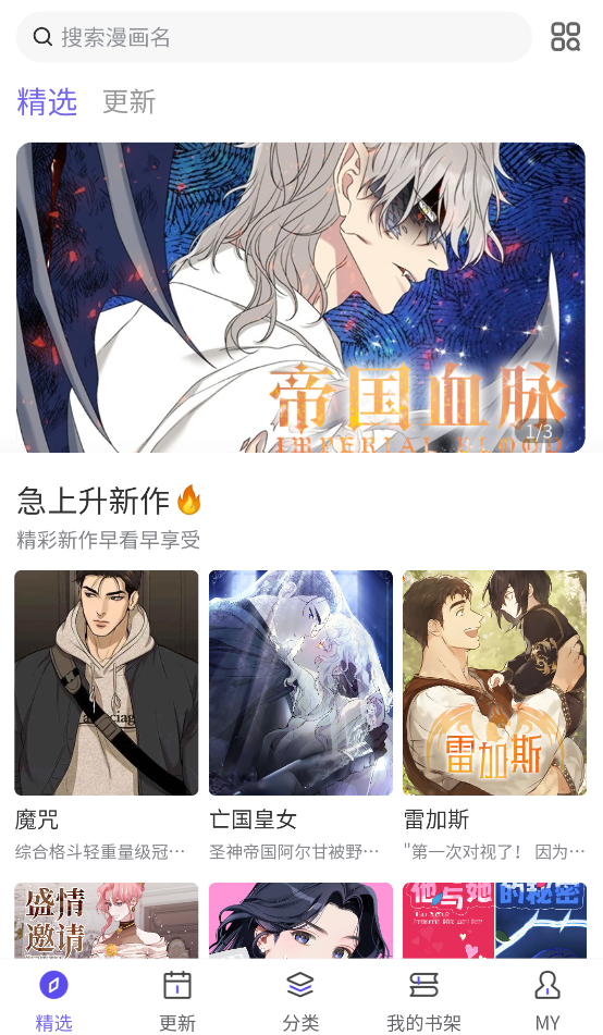 精选聚合全站热门作品和最新更新内容,像《帝国血脉》《魔咒》等热门BL漫画都会第一时间推送,还支持个性化推荐,帮你发现更多宝藏作品。