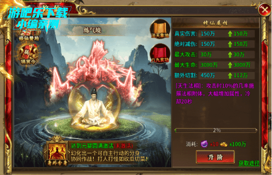 修仙系统是角色养成的核心玩法之一,通过消耗道具和金币升阶,能看到右侧的属性面板,每次升阶都会大幅提升绝对减伤、最大攻击、生命和切割伤害,而且还有概率触发“天生法相”,短时间内获得爆发性属性加成。等玩家升到元婴期,还能解锁一个可以自主战斗的分身,无论是刷怪还是打BOSS,都相当于多了一个强力队友,让你体验真正的“躺赢”快感。