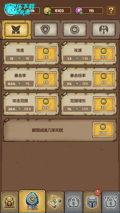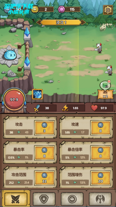 1、在开战之前可以先通过金币来提升自己的属性,优先范围、攻速和攻击力三点。