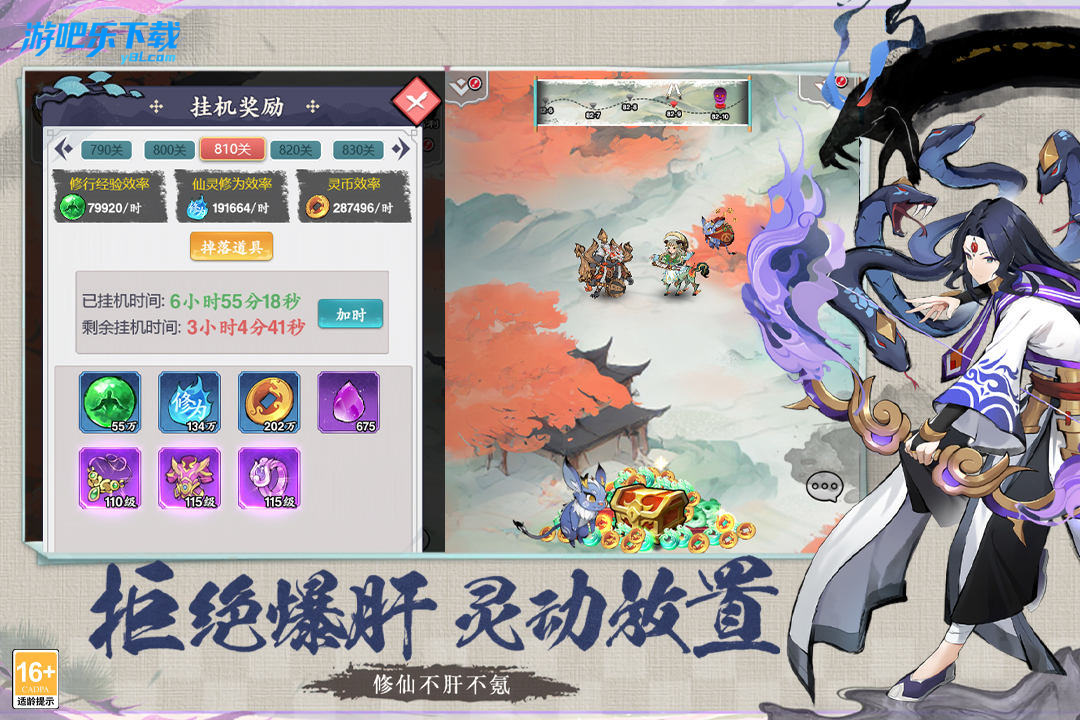 2.挂机收益:离线挂机是游戏的特色,玩家即使下线,角色也会自动进行修炼、挑战副本,积累经验、金币与装备等资源。上线后即可一键领取收益,此外,游戏还提供了摘星、探寻遗迹等多种途径能够帮助玩家永久提升实力。