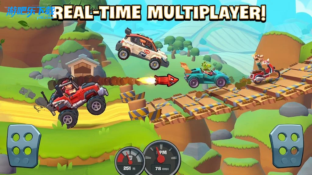 多人模式:实时 PvP 竞速,可使用道具干扰对手,率先到达终点或完成特定目标获胜