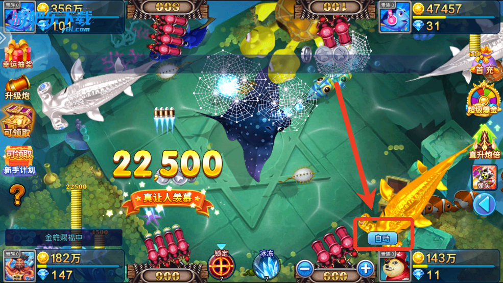 接下来是注意鱼潮的问题。通常鱼潮基本是送分的,一般是小鱼在外面,大鱼在中间,这时候想打大鱼的话必须先把周围的小鱼清理掉才行。这里就有个技巧,就是利用边缘反弹,通过别人打小鱼漏出来的空隙来打大鱼,顺便也将大鱼周围的小鱼都包含在内了。这样即使打不中大鱼,也可以打中周边的小鱼,基本上是稳赚不赔的。