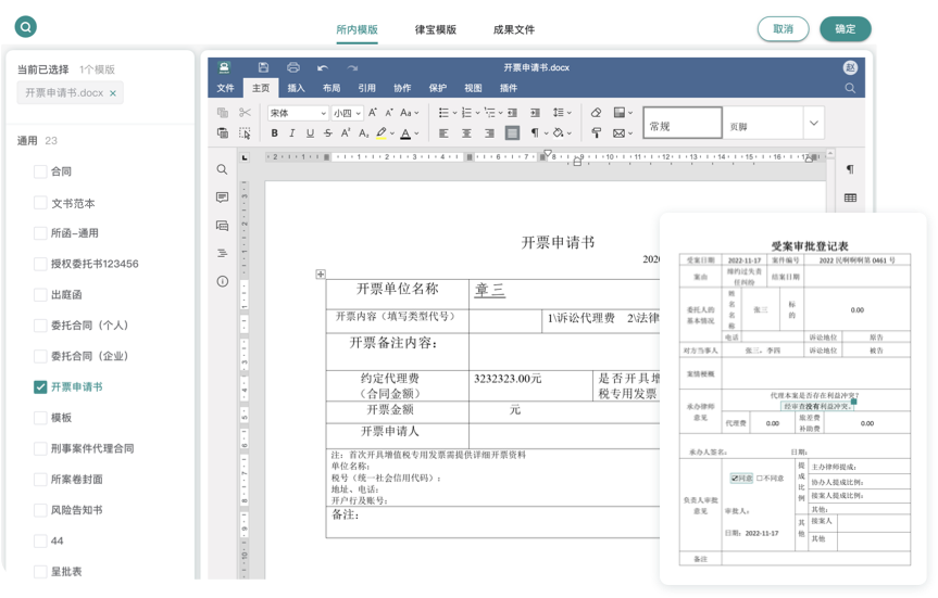 根据案件信息自动生成案件材料,可批量操作;文档在线协同编辑与自动生成案件网盘目录存储;文档自动归入工作底稿,轻松在线协作标