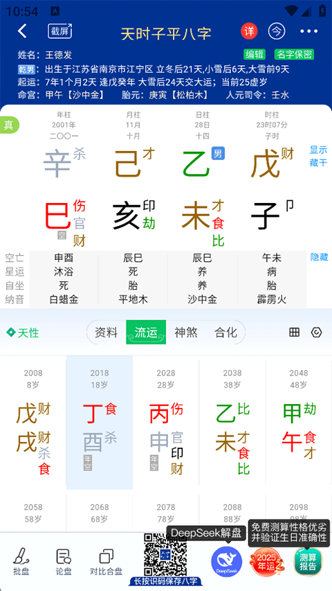 全周期运势轨迹:无限制查看大运、流年、流月、流日、流时,切换直观便捷,支持多人八字并列对比分析