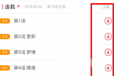 2、然后在漫画的详情页面里,滑动页面到目录列表中,通过点击目录列表右侧的下载按钮,就可以直接缓存漫画章节了。