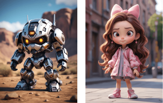 提示词参考1:Q版,盲盒,机甲套装,超精细,高分辨率,3D效果图,极其精细,立体效果,黏土材质