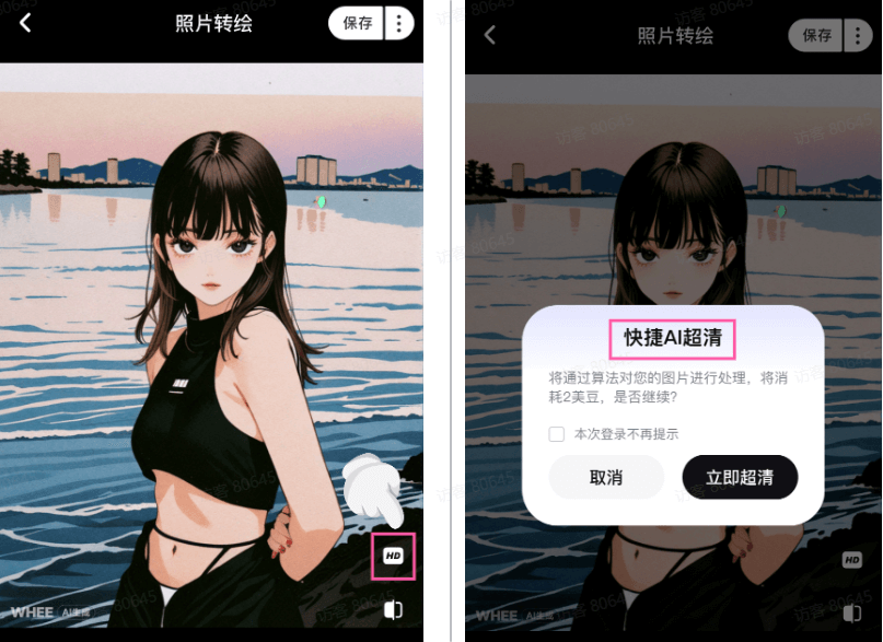 觉得图片不够清晰?别担心,点击右下角的「快捷AI超清」让你即刻拥有超清质感美图!