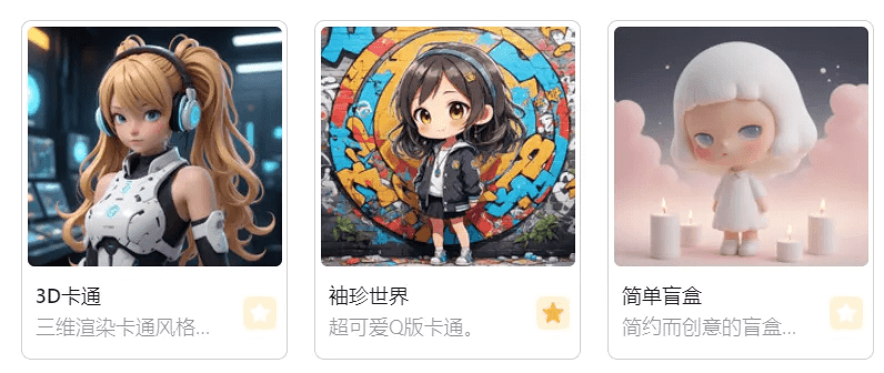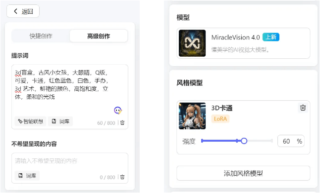 · 当然也可以进入高级创作使用风格模型LoRA,比如官方的{3D卡通}{袖珍世界}{简单盲盒}LoRA,都可以帮你生成风格化的盲盒呦!