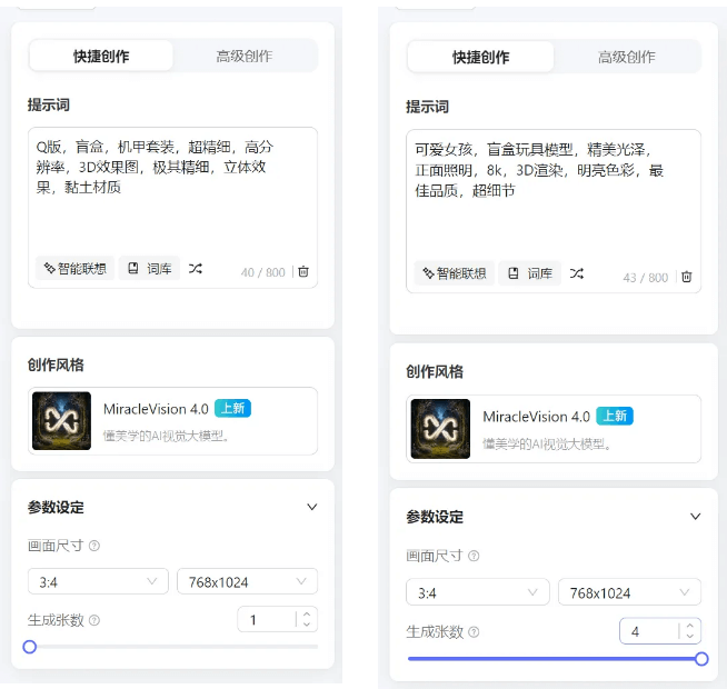 · 进入快捷创作,在提示词中描述自己想要的盲盒类型,例如可爱的小精灵盲盒,机甲战士等等,还可以配合颜色光线进行描述。