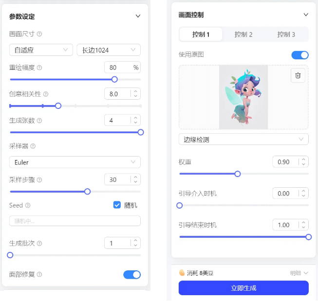 · 画面控制不需要重新上传,直接打开原图,模型选择边缘检测,点击生成等待几秒就可以获得属于自己的盲盒啦!