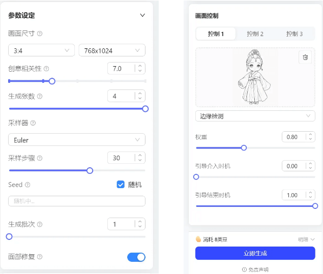 · 画面控制需要上传无色线稿,权重开到0.8,模型选择边缘检测,点击生成!切记线稿线不要太粗!