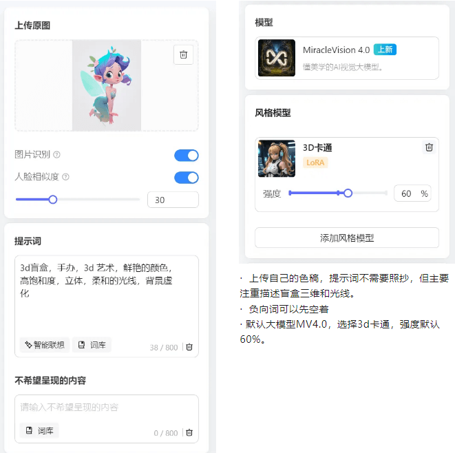 · 提示词主要要强调3d效果和立体光线,当然要根据自己的需求去描述手办颜色。