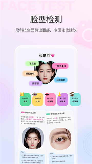 AI 测脸型:拍照识别脸型(圆脸 / 方脸 / 鹅蛋脸等),分析三庭五眼、五官比例