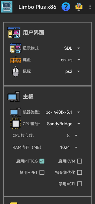 CPU:核心数、架构(x86/x86_64)、开启 MTTCG 加速
