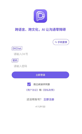 1、在本站下载安装好dkchat官方版,点击下方的【立即注册】按钮,进入账号注册流程,输入昵称、手机号、验证码等信息,设置好密码;