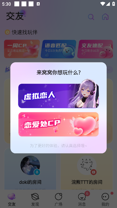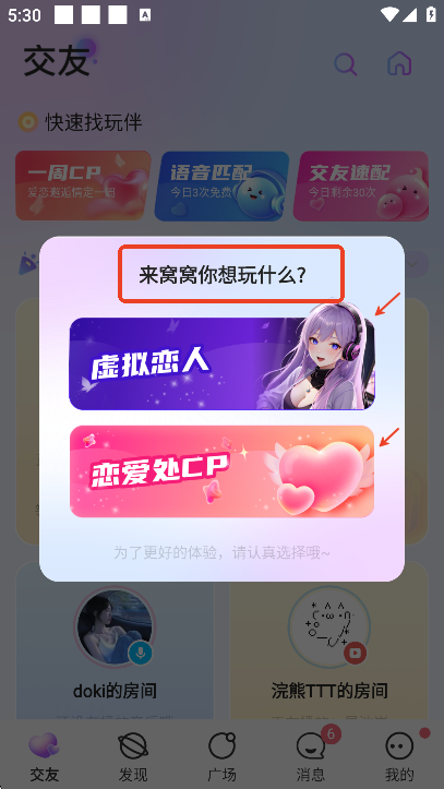 进入首页,选择跟虚拟恋人交友还是跟真人交友