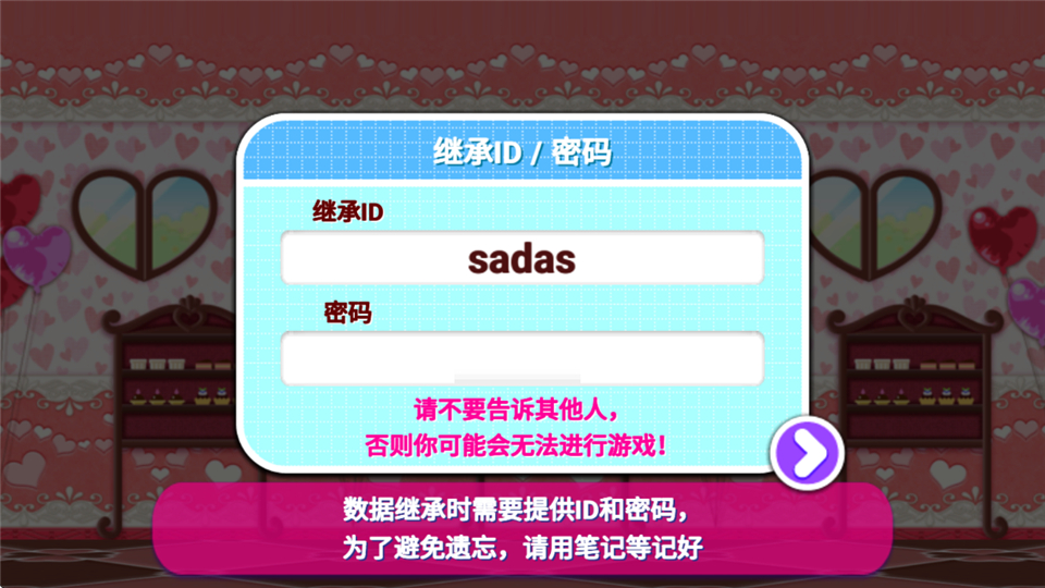 5、紧接着你会获得创建时的ID以及密码现在即可退出游戏(不要进入下一步),在你的另一个新的设备中安装游戏后;