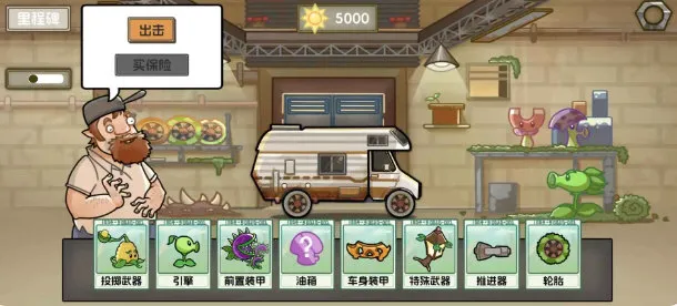 2、每次闯关前,你都会进入一个改装界面。在这里,可以用已有的阳光购买或升级各种植物配件(比如豌豆射手、坚果装甲),把它们安装到战车上
