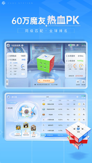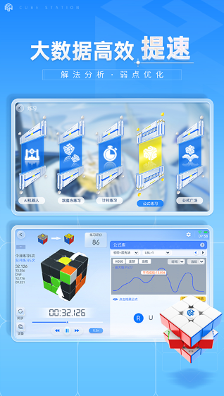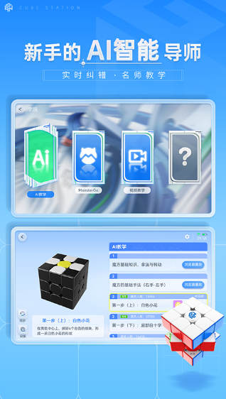 CubeStation是GAN 魔方 (世界冠军常用专业品牌) 旗下的免费魔方教学、训练与竞技平台,支持智能魔方、普通魔方、虚拟魔方三种操作模式,覆盖从新手入门到大神进阶的全水平段需求,提供AI 教程、拍照复原、大数据分析、全球在线对战等核心功能,提升魔方技巧、交流心得的专业工具Cube Station。