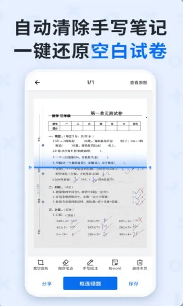 1. 拍试卷能自动清除笔迹,完美还原空白试卷,方便分析学情与反复训练。