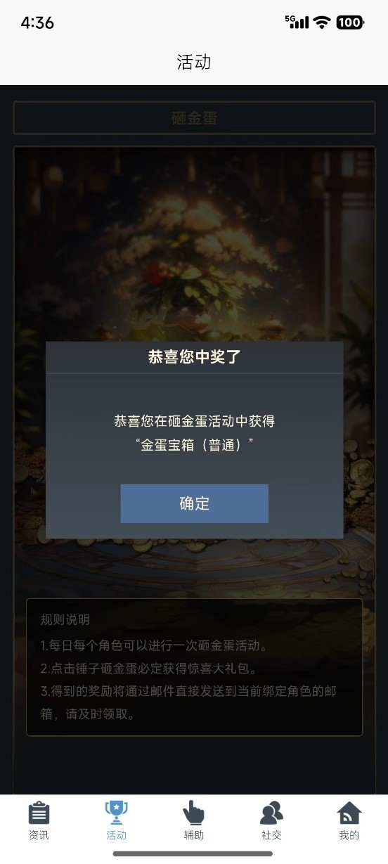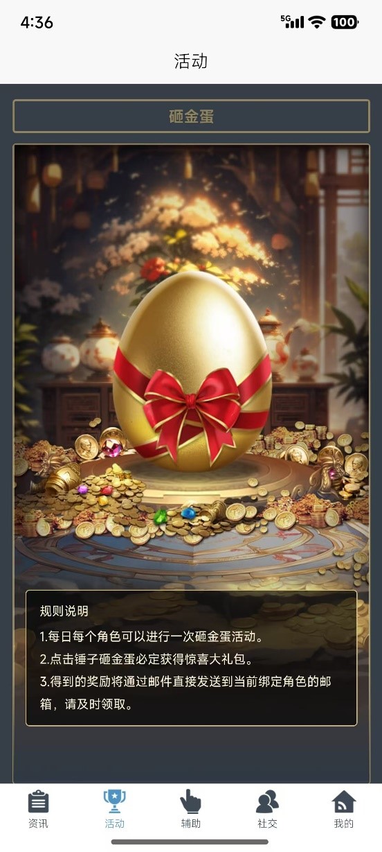 绑定角色后可以在活动页内参与砸金蛋活动,每个角色每日参与1次,活动奖励会发送到对应的绑定角色邮箱内。