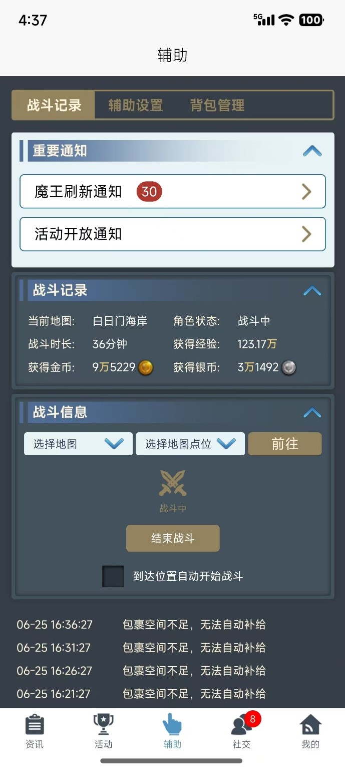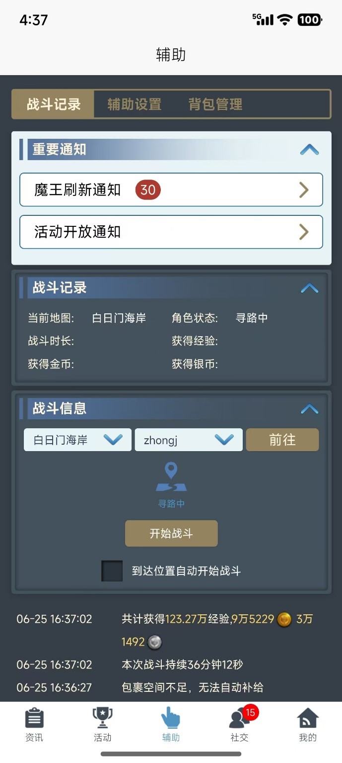重要通知内可以查看魔王刷新和勇者试炼活动、魔气地图活动的相关消息通知。 战斗记录显示当前角色的战斗状态,如果在自动战斗中会汇总显示本次自动战斗的相关收益信息。 战斗信息包含两部分,第一部分为可操作部分,可以通过已设置的寻路点功能操作角色前往指定地图的寻路点进行自动战斗,必须提前设置了寻路点才能进行相关前往操作。开启自动战斗时,召唤物自动切换为攻击状态,停止自动战斗召唤物仍为攻击状态;第二部分是最下方会同步显示自动战斗的详细信息。
