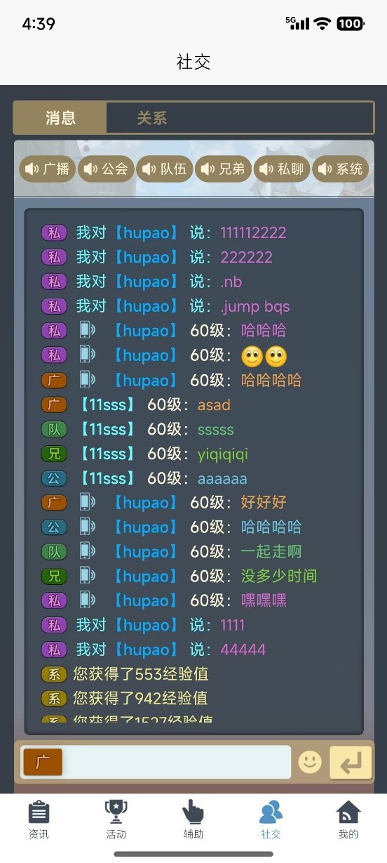 【社交消息】 消息频道包含广播、公会、队伍、兄弟、私聊和系统,对不想收到消息的频道可以进行屏蔽。通过助手进行发言在聊天界面显示中会有一个手机图标标志进行区分显示。