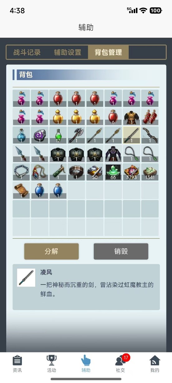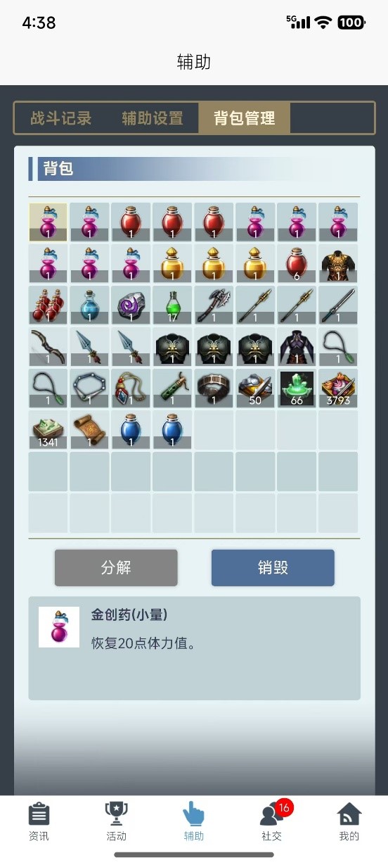 【背包管理】 背包管理页内可以查看当前角色背包内物品情况,可以进行分解和销毁操作。