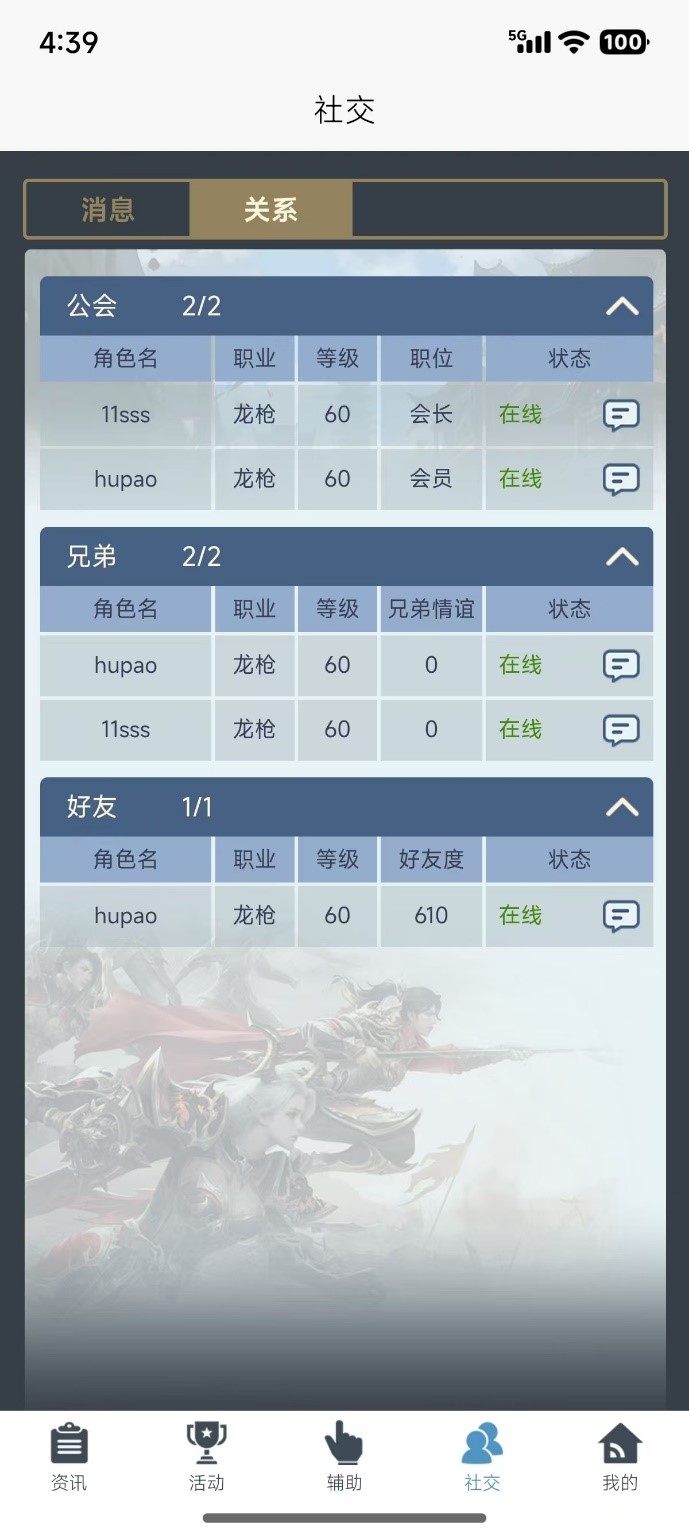 【社交页签】 社交页内包含消息和关系两个功能页,绑定在线角色可以与玩家沟通交流,可以查看自己的公会、兄弟和好友在线情况。
